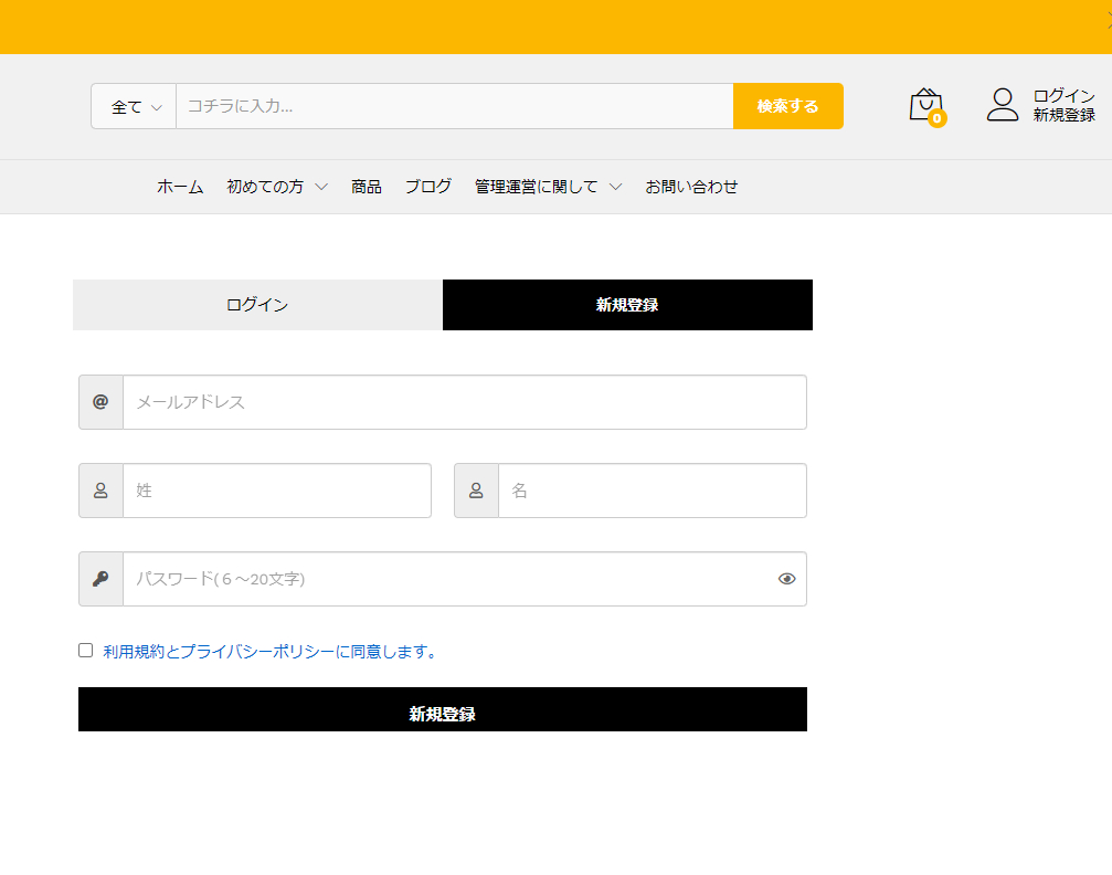 - ショップページの右上のアイコン「新規登録」をクリックして、会員登録ページに移動します。会員登録が済んでいる方は、同じくこちらからログインします。