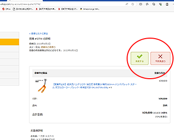 - マイアカウントページの見積りリストから「保留中」の見積り内容を確認して、承認するかしないか判断します。承認する場合は「承諾する」をクリックして決済に進みます。送信したメールからでも承認/否承認を選ぶことができます。