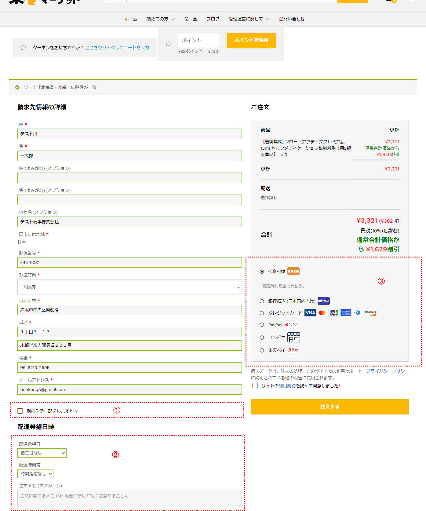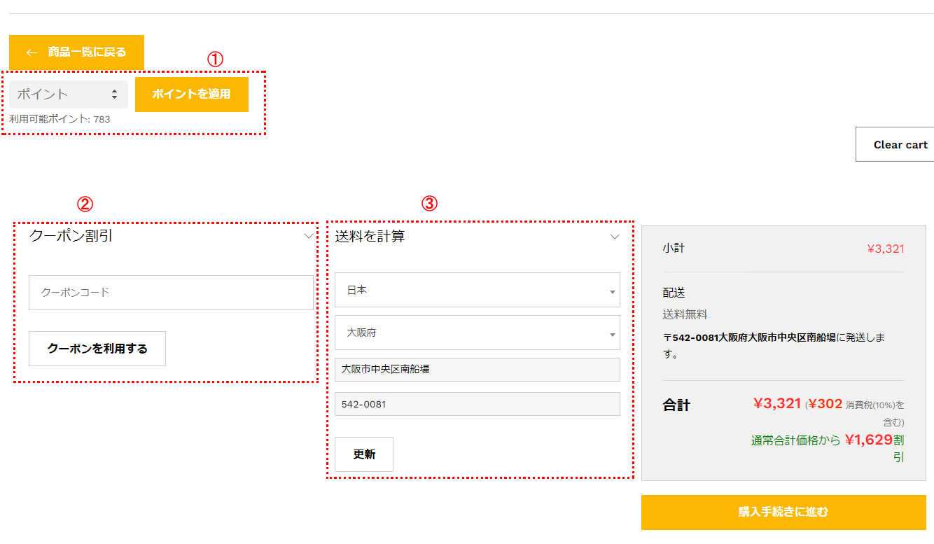 - ①ポイントや②クーポンを利用する場合は、必要な情報を入力してください。