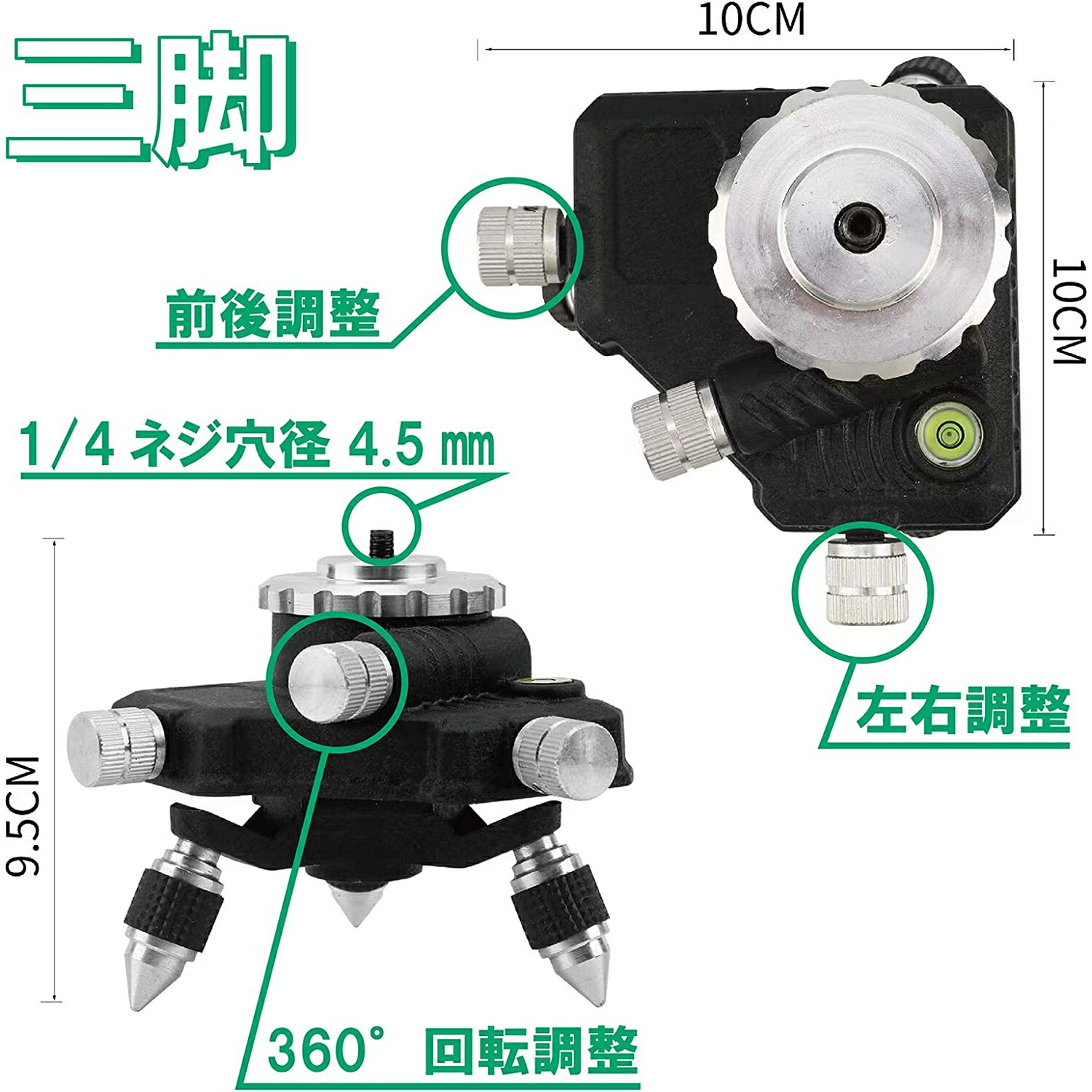 また、4度以上の傾斜のある場面でも、その場で調整することが出来、様々なシーンでの利用が可能です。2水平面360°と2垂直面360°の16グリーン線を搭載し、作業スペース周りの壁から67mmと、壁際での使用も可能です。床、壁、天井を全部カバーできます。また、この製品は18650リチウム電池を使用しています。