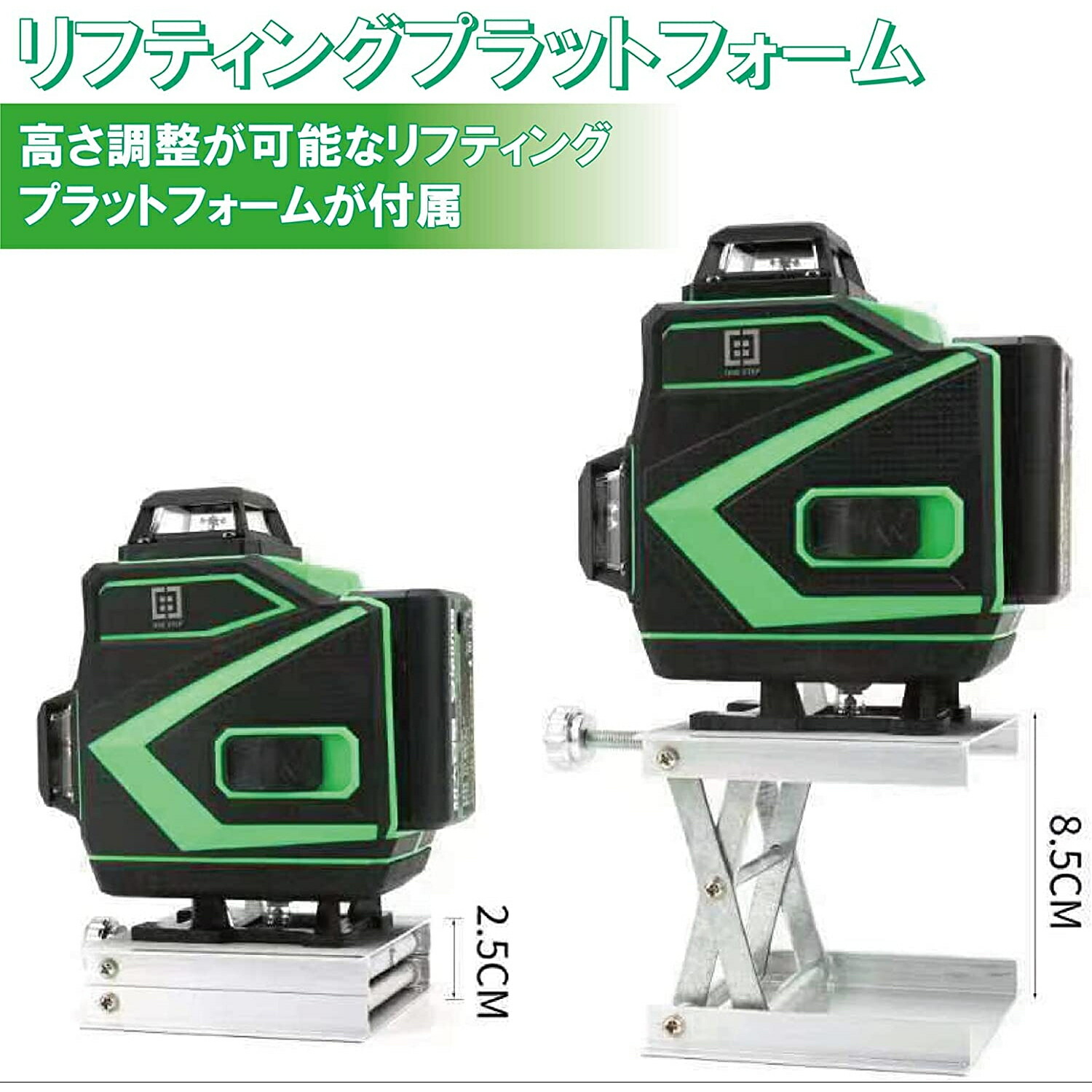 2水平面360°と2垂直面360°の16グリーン線を搭載し、作業スペース周りの壁から67mmと、壁際での使用も可能です。床、壁、天井を全部カバーできます。また、この製品は18650リチウム電池を使用しています。