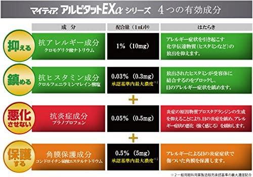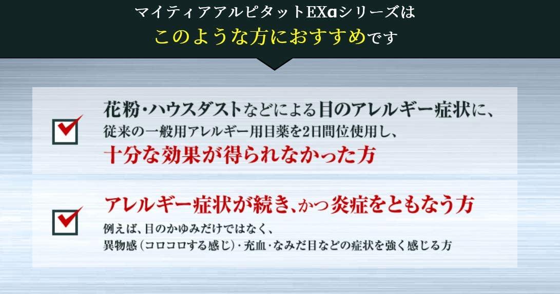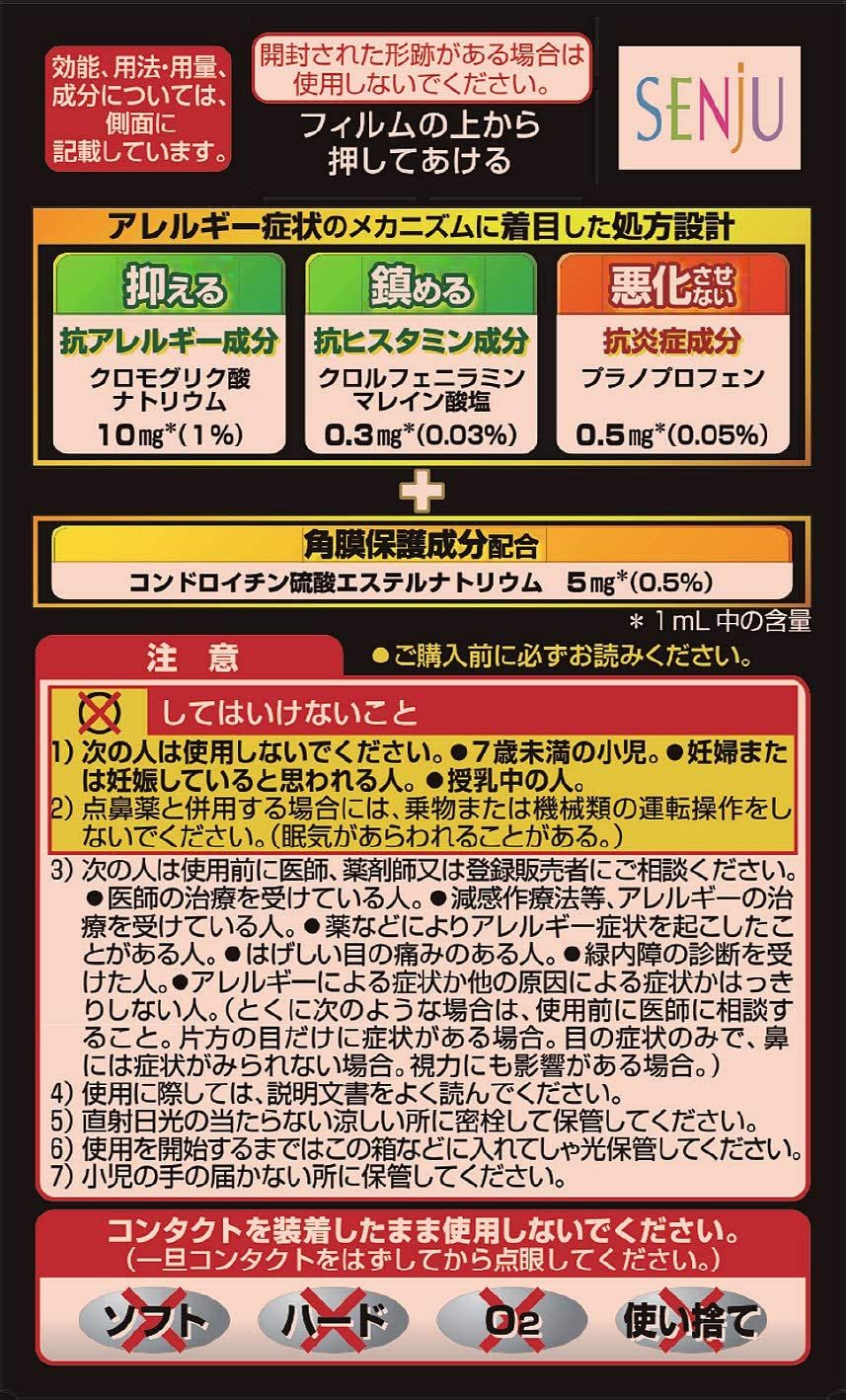 花粉、ハウスダスト(室内塵)などによる次のような目のアレルギー症状の緩和:目の充血、目のかゆみ、目のかすみ(目やにの多いときなど)、なみだ目、異物感(コロコロする感じ)