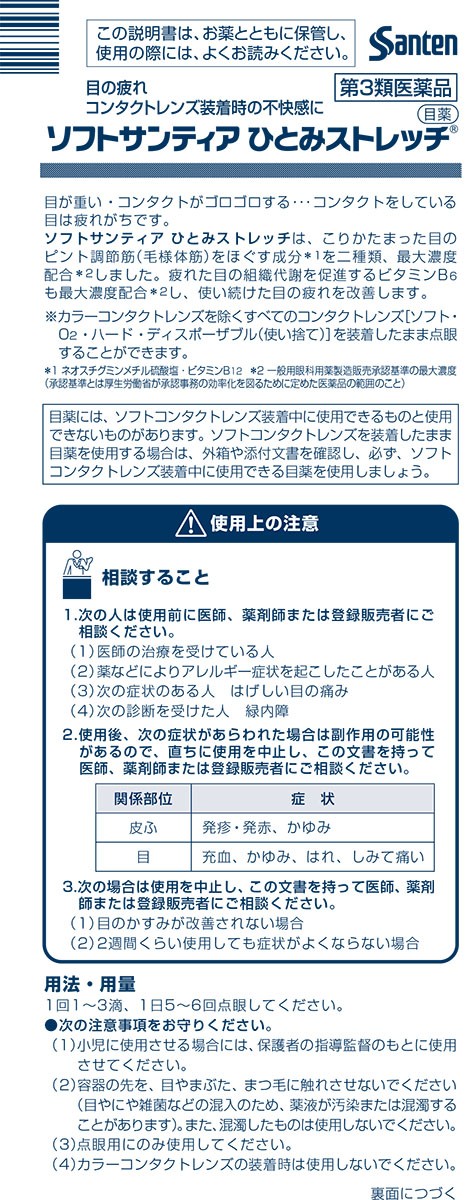 ●コンタクトレンズをお使いの方の目の疲れや不快感などの改善を考えた目薬です。パソコンやスマートフォンなどのデジタル機器の普及により、現代人は、近くを凝視することが増えています。ソフトサンティア ひとみストレッチは、目の疲れの大きな原因であるピント調節筋※1のコリをほぐすネオスチグミンメチル硫酸塩とビタミンB12の2種類の成分を最大濃度配合※2しました。組織代謝を促進するビタミンB6も最大濃度配合※2。防腐剤は無添加※3なのですべてのタイプのコンタクトレンズ(ソフト・O2・ハード・ディスポーザブル(使い捨て))※4を装着したまま点眼することができます。瞳をやさしく包む、しっとりしたさし心地です。
