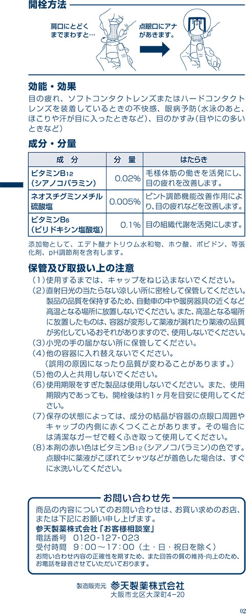 ・本剤の赤い色はビタミンB12(シアノコバラミン)の色です。点眼中に薬液がこぼれてシャツなどが着色した場合は、すぐに水洗いしてください。