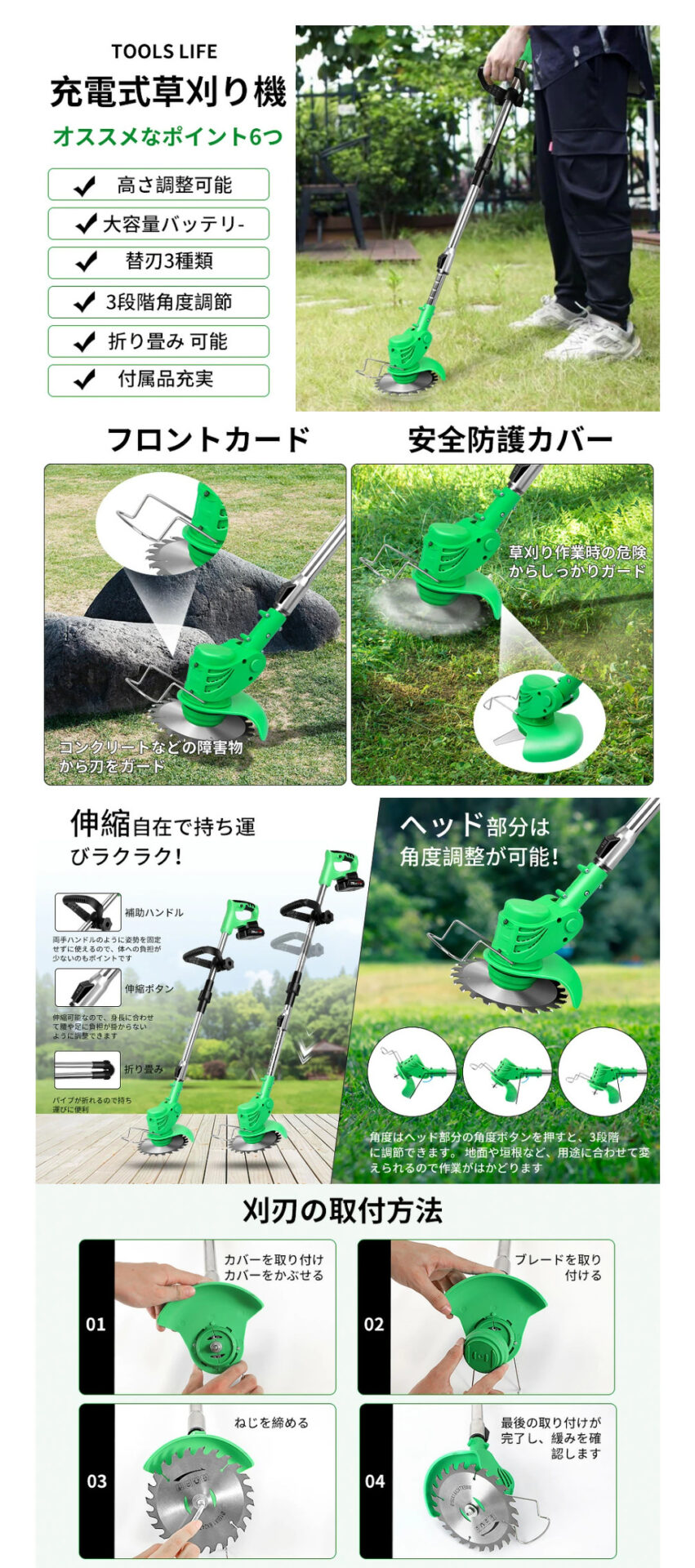 ◆コードレス草刈機はどこでも気軽に使えます!補助輪で掃除機のような動作で草刈りが可能です。コードレスでコンセントの確認等の電源確保のストレスから解放!壁際や低い場所も手楽にカットできます。
